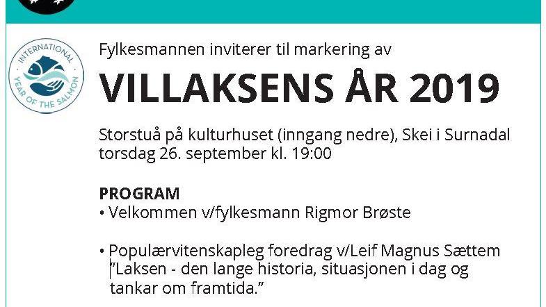 Markering av Villaksens år 2019 i Surnadal Fylkesmannen i Møre og Romsdal inviterer til markering av Villaksens år 2019Tid og stad: Storstuå på kulturhuset (inngang nedre), Skei i Surnadaltorsd... Publisert 23.09.2019 kl. 14:01
