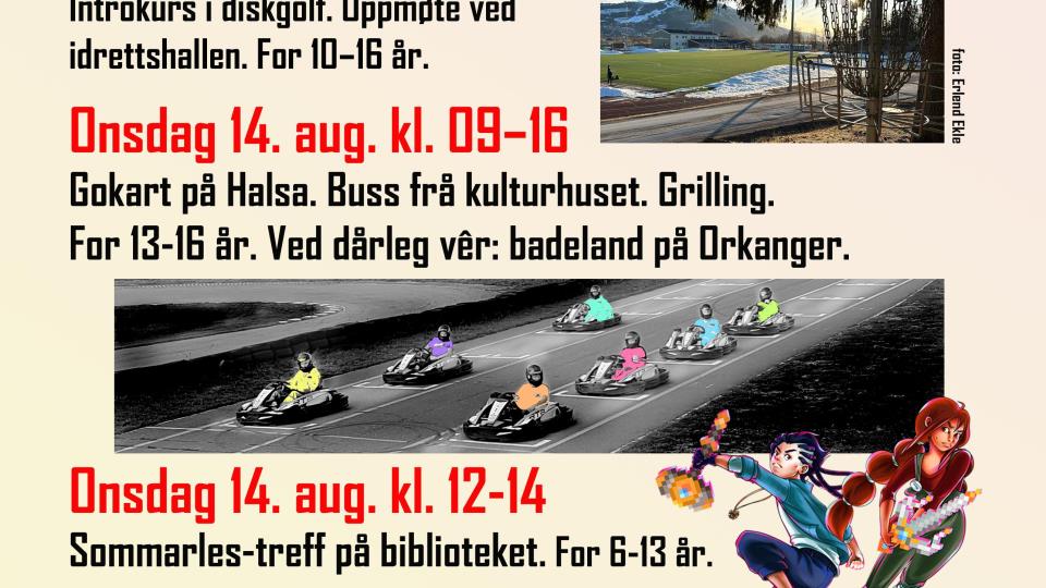 Gratis ferieaktivitetar i august Det blir tilbod om gratis ferieaktivitetar for barn og unge i midta av august. Påmeldingsfrist er 18. juli kl. 15. Påmelding sommarferie-aktivitet i S... Publisert 10.07.2024 kl. 08:52
