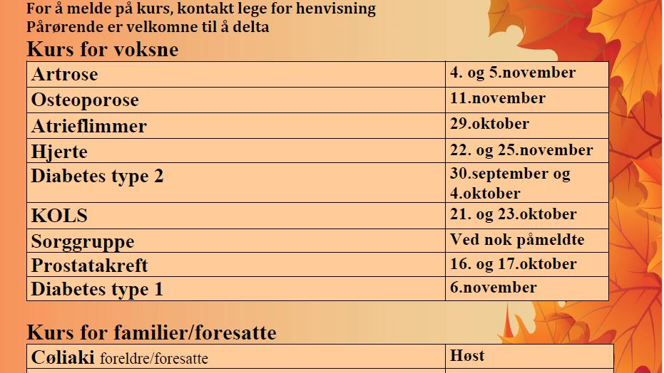 Kurs for pasientar og pårørande hausten 2024 Kursa foregår ved Kristiansund sjukehus. Kontakt lege for henvisning og påmelding. Publisert 06.08.2024 kl. 15:12